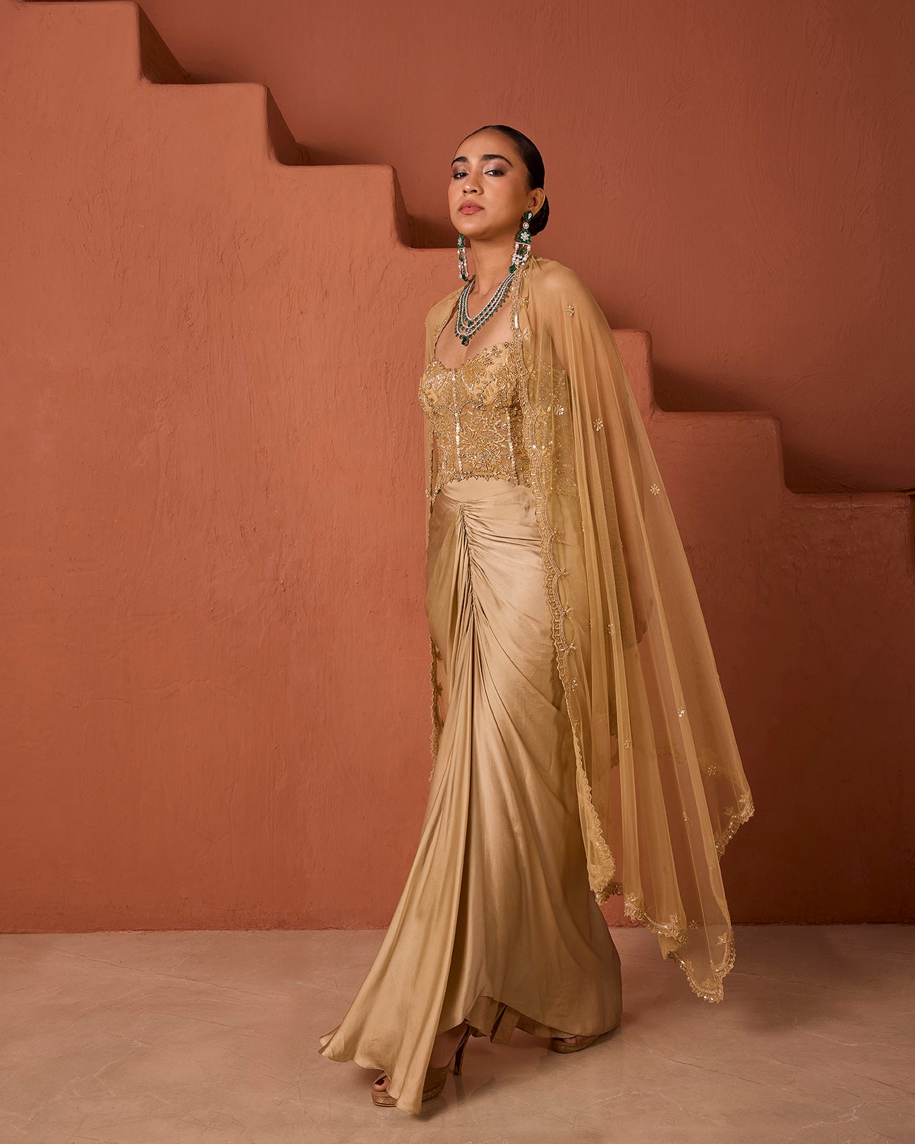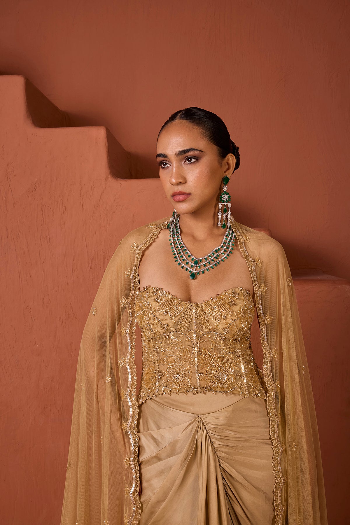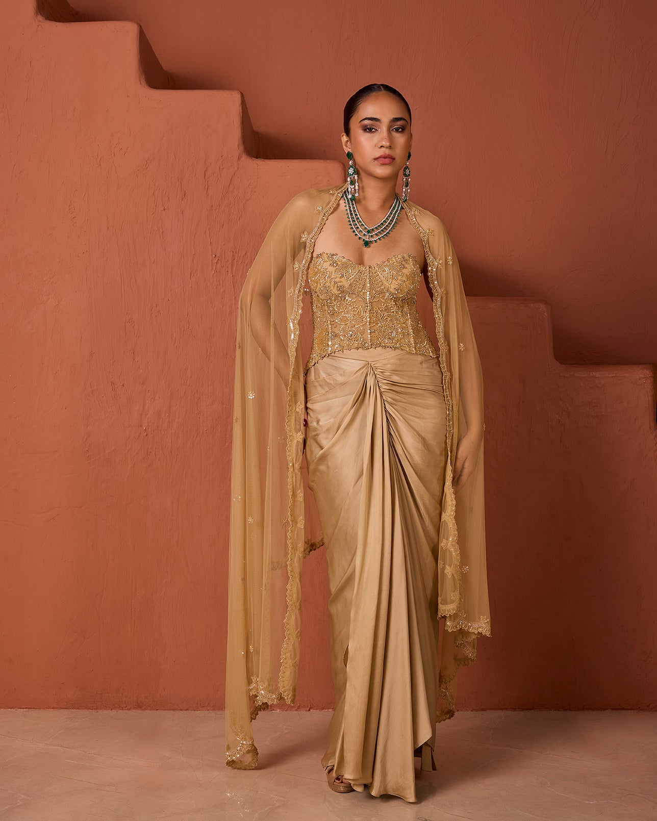 Molten Gold Corset Paired with a Draped Skirt & Scalloped Dupatta