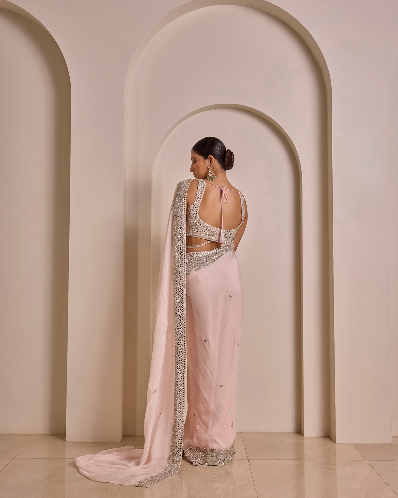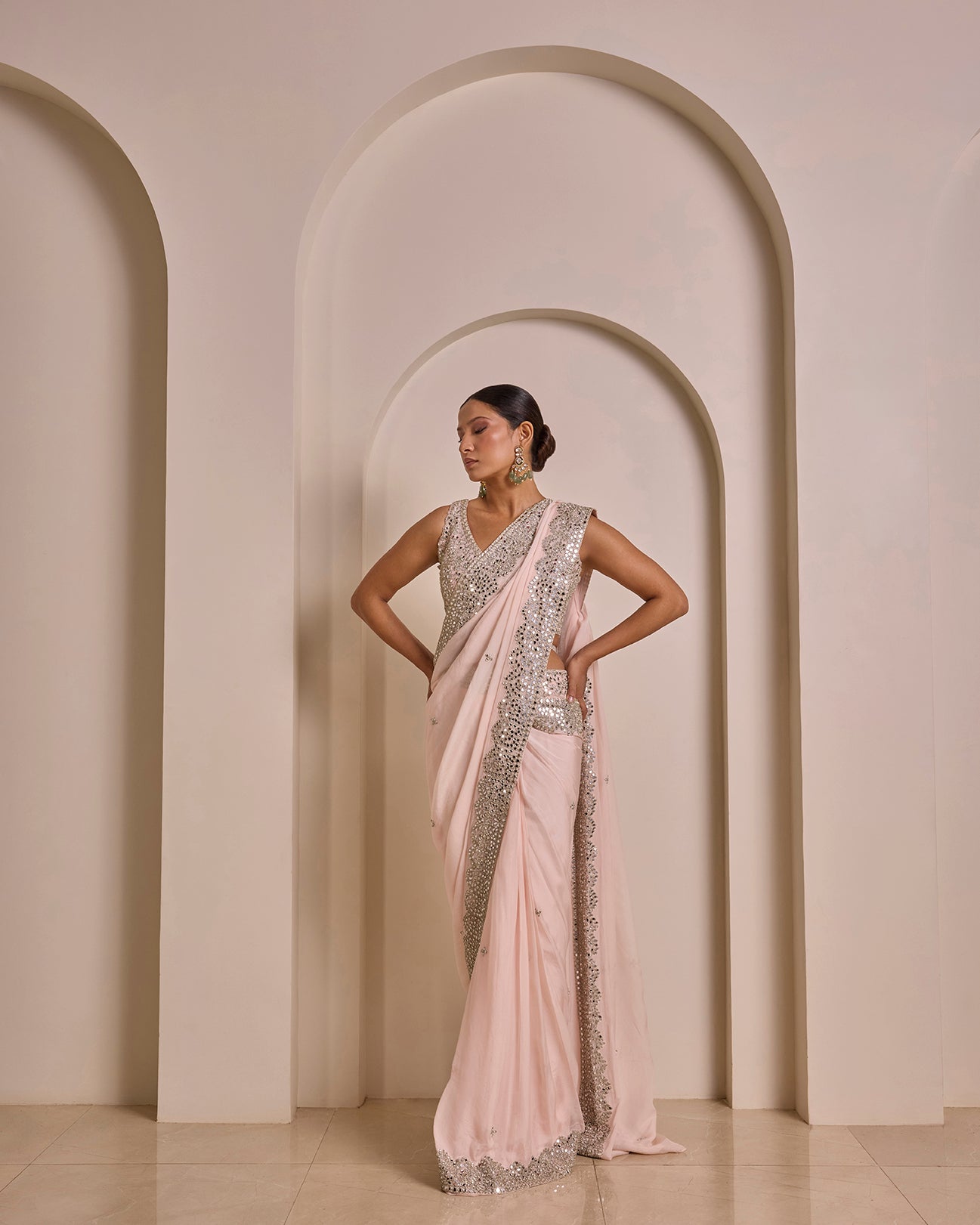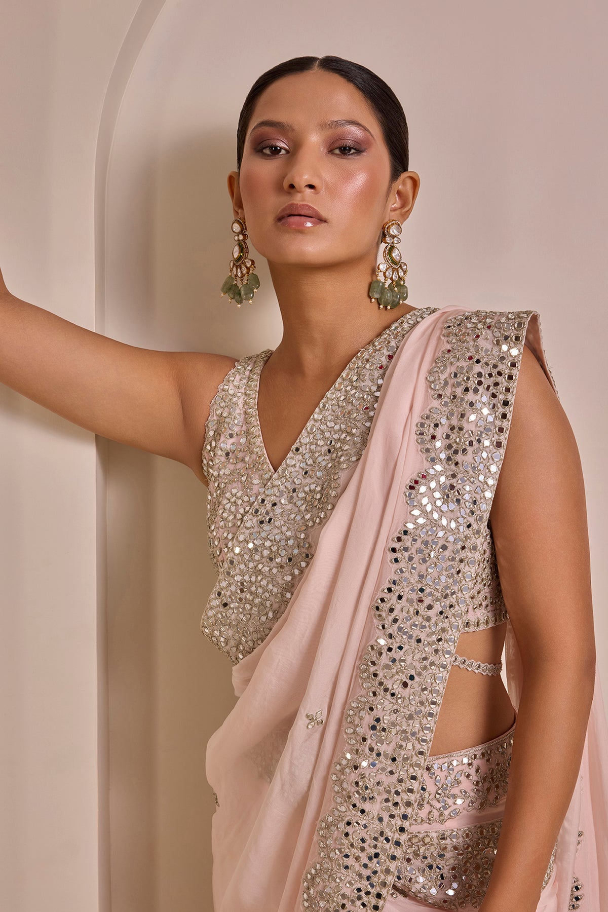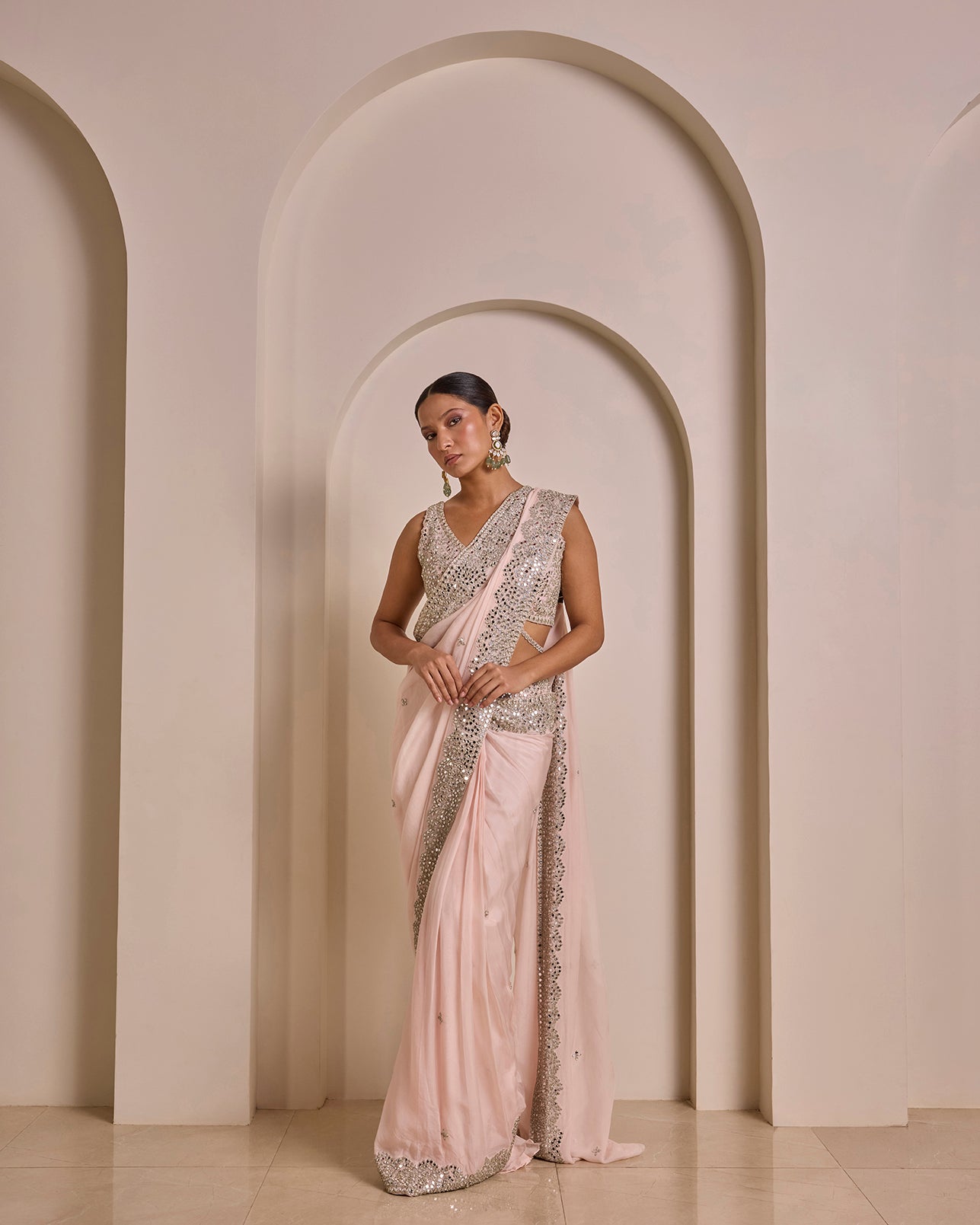 Pastel Pink Mirror Work Pre Draped Saree Set