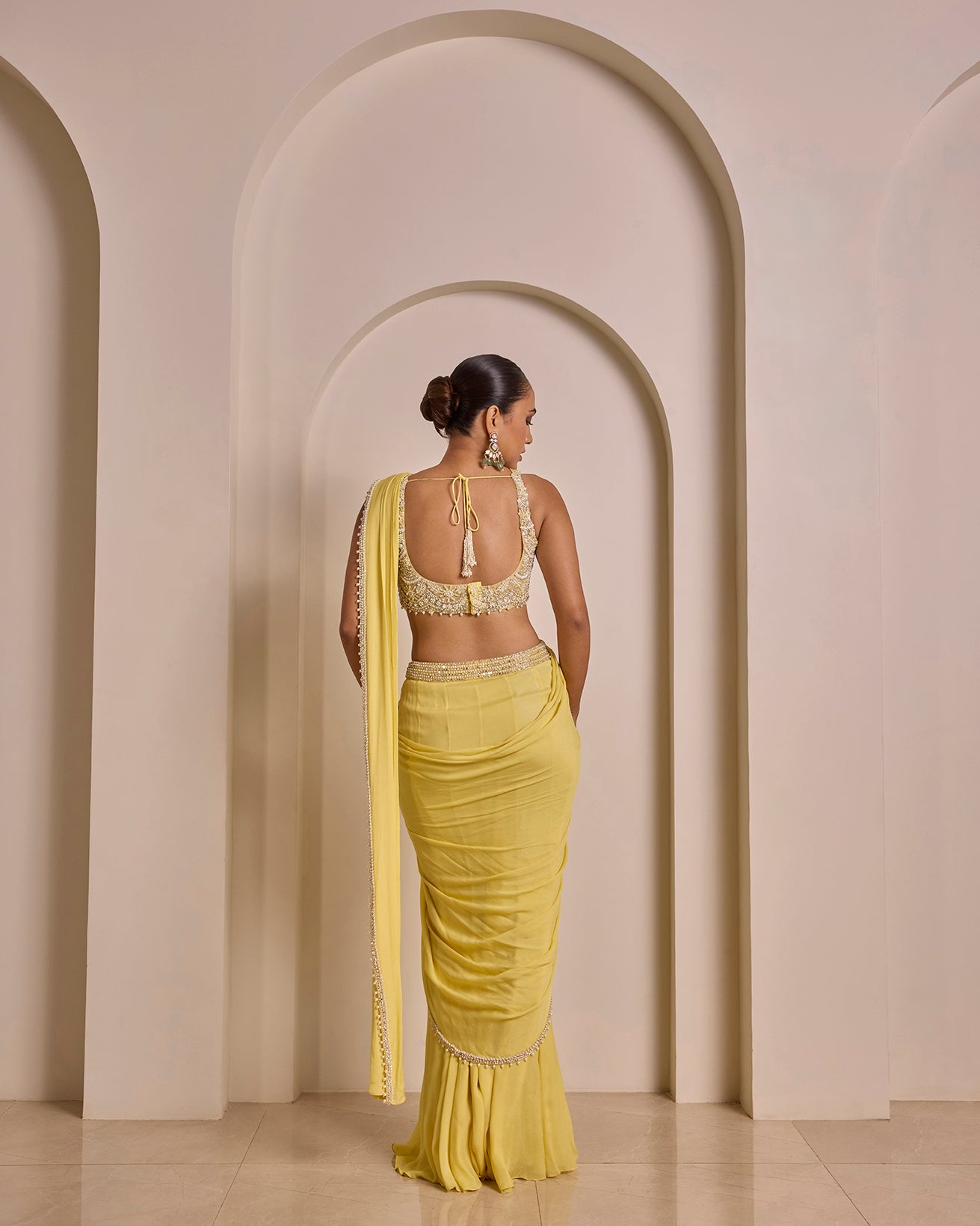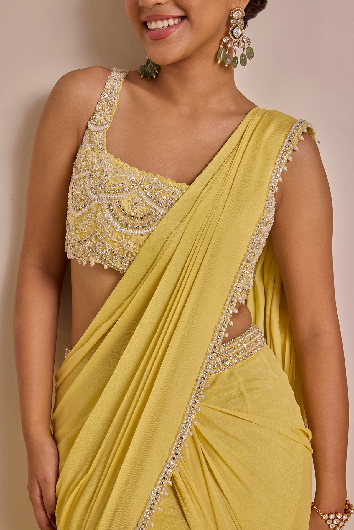 Pastel Yellow Saree Set with Pearl Hand Embroidery