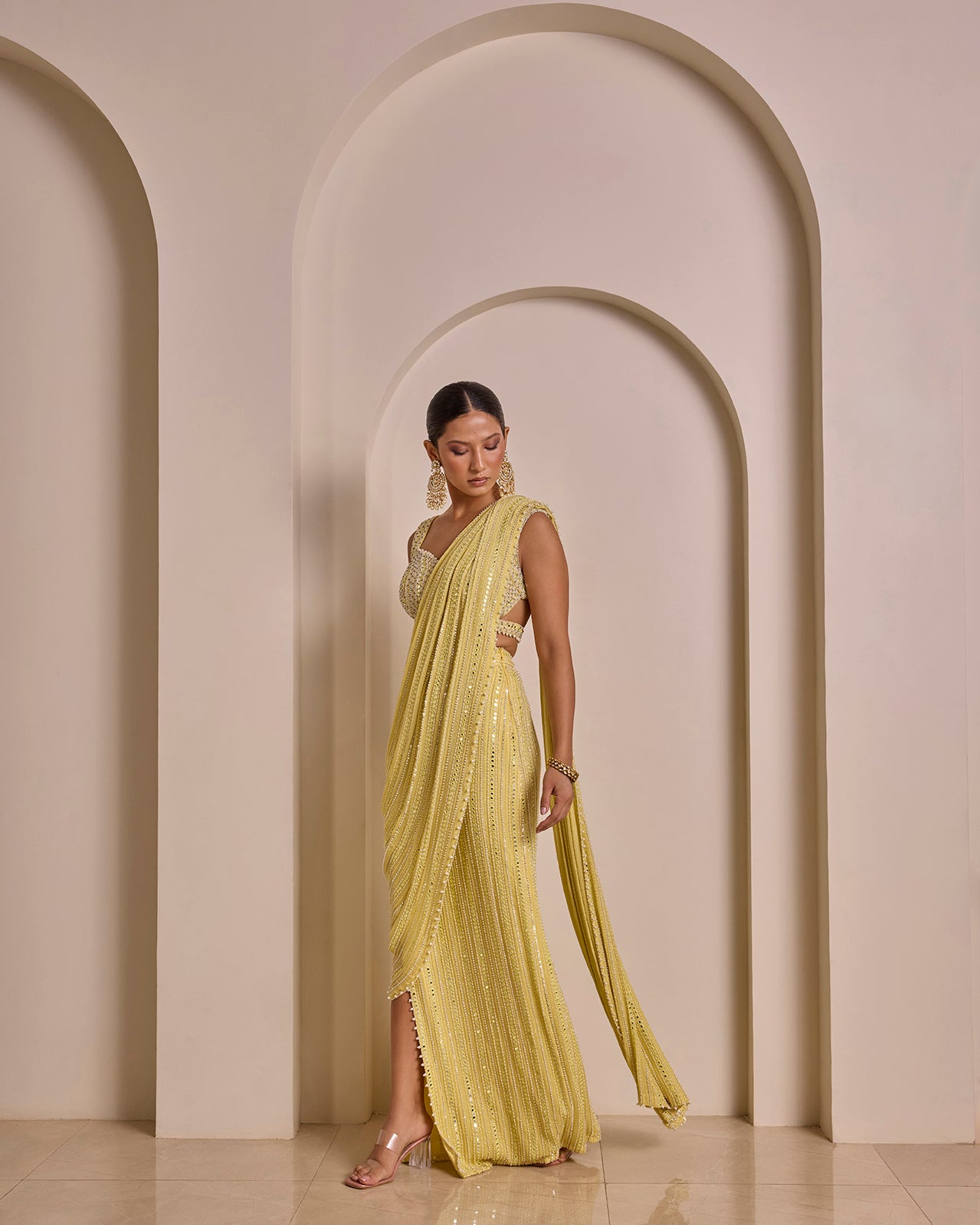 Yellow Mirror Work Hand Embroidered Saree Set